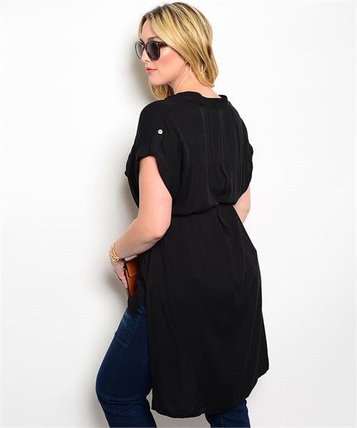 This woven short sleeve top features a a v-neckline, hi-low hem and includes a small belt.