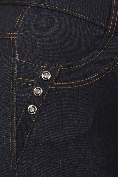 Description: Plus Size Jeggings: 4 pocket, high waist, skinny jeans with Rhinestones at side pockets and functional fly zipper and button closure at front.
